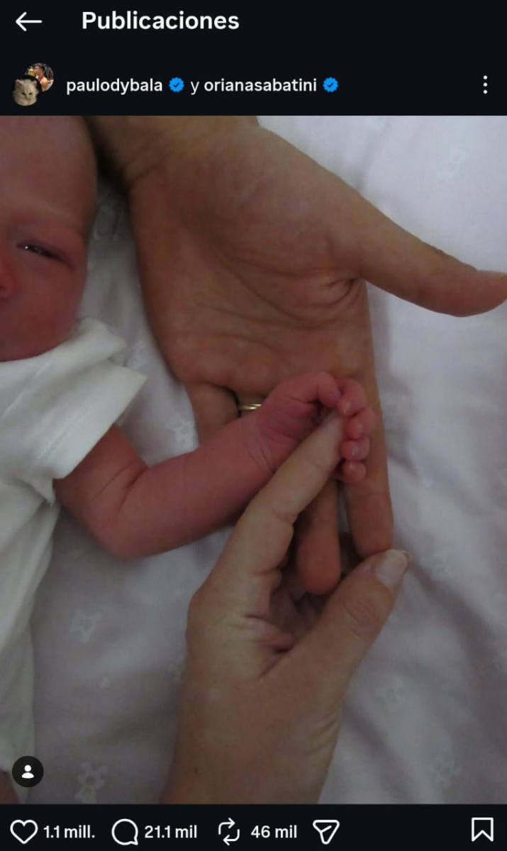 Oriana Sabatini y Paulo Dybala compartieron la primera foto de su hija Gia: “Un aplauso para mami y papi”. La cantante y el futbolista se convirtieron en padres este lunes.